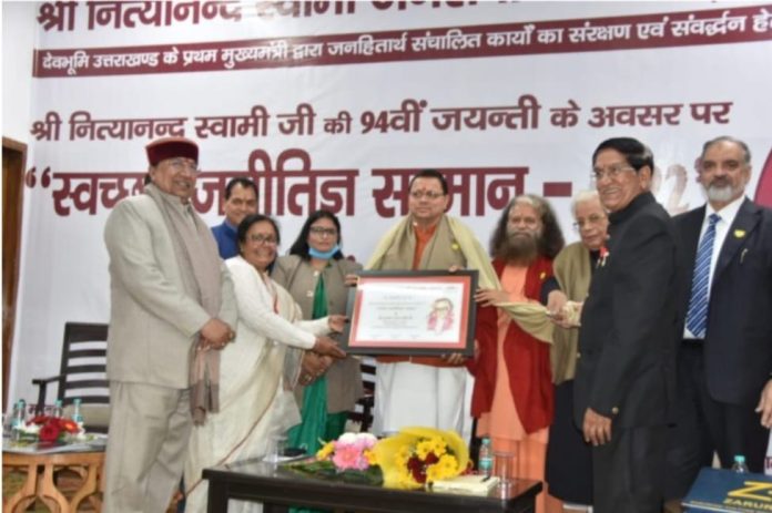 देहरादून: नित्यानंद स्वामी जन सेवा समिति द्वारा मुख्यमंत्री पुष्कर सिंह धामी को स्वच्छ राजनीतिज्ञ सम्मान 2022 से सम्मानित किया गया। इस दौरान मुख्यमंत्री ने संगीत, शिक्षा, उद्योग, चिकित्सा एवं सांस्कृतिक संपदा से जुड़े व्यक्तियों को भी सम्मानित किया।